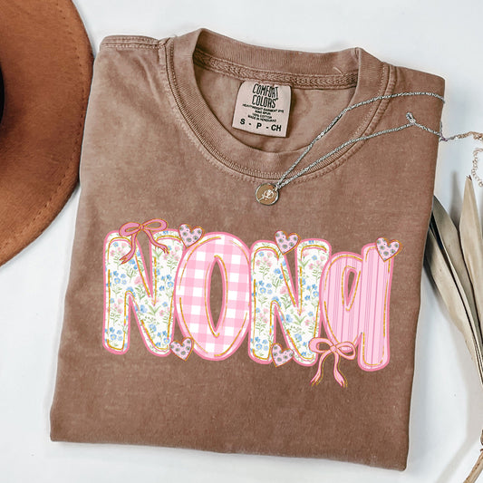 Retro Nona Coquette Shirt - Vintage Floral & Gingham Nona T-Shirt- Nona Mother's Day Gift - Floral Pink Gingham Nona Shirt for Grandmother