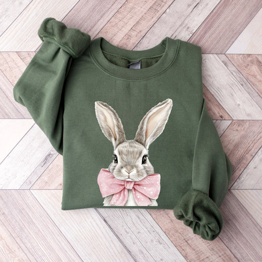 Cute Easter Bunny Sweatshirt - Hand-Drawn Rabbit with Pink Bow Crewneck - Spring Holiday Pullover