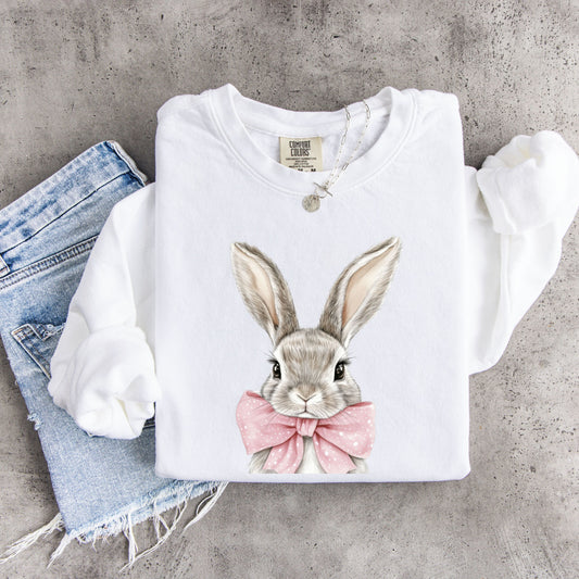 Easter Bunny Crewneck T-Shirt - Hand-Drawn Rabbit with Pink Polka Dot Bow - Spring Aesthetic Apparel
