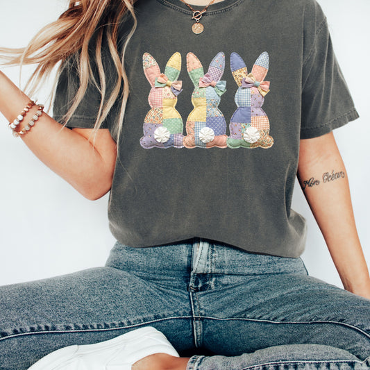 Faux Patchwork Easter Bunny Shirt, Comfort Colors® Floral Rabbit Tee, Vintage Quilt Style Spring Top, Cottagecore Coquette Easter Gift Women