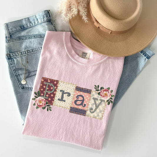 PRAY Faux Patchwork T-Shirt | Floral Faith Shirt | Christian Gift | Vintage Quilted Look Scripture Tee | Comfort Colors Prayer Shirt