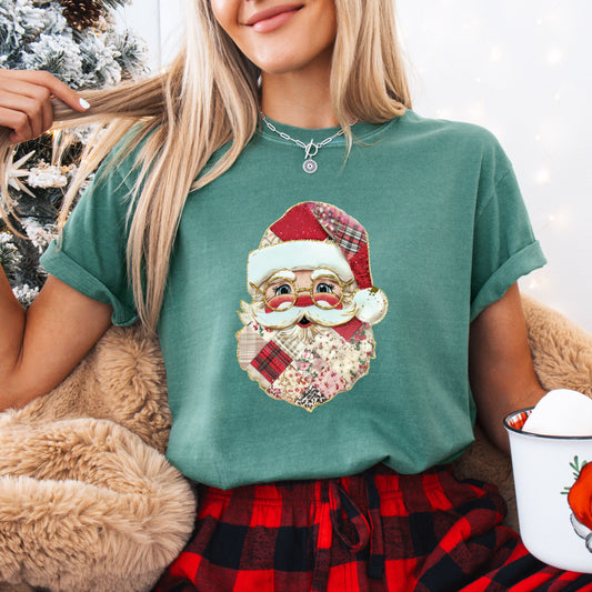 Faux Patchwork Santa T-Shirt | Vintage Quilted Look Christmas Shirt | Cozy Holiday Tee | Buffalo Plaid Santa Claus Graphic | Cute Xmas Gift