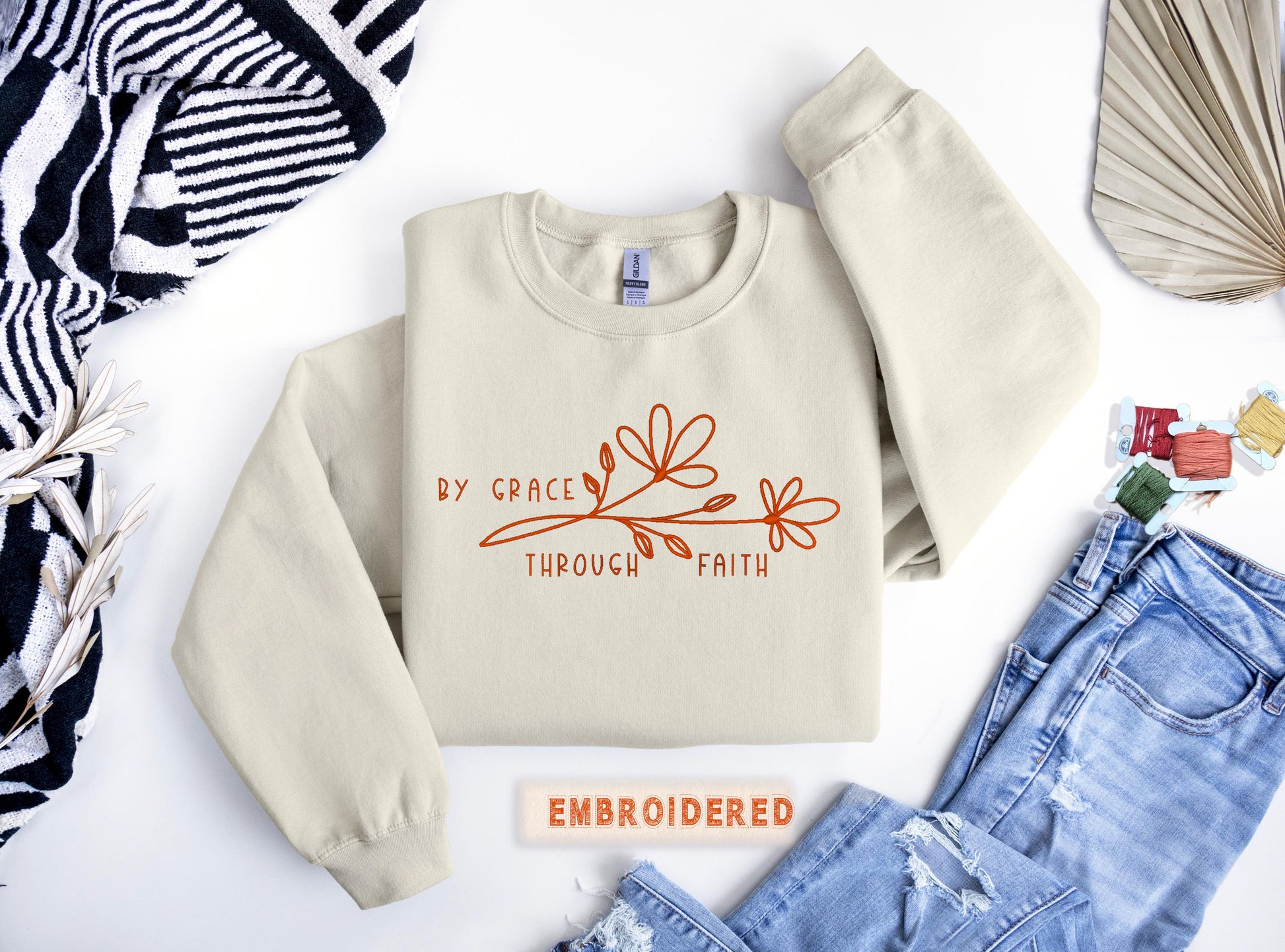 By Grace Through Faith Embroidered Christian Sweatshirt, Religious Bible Verse Sweater, Faith Based Gift for Women and Men