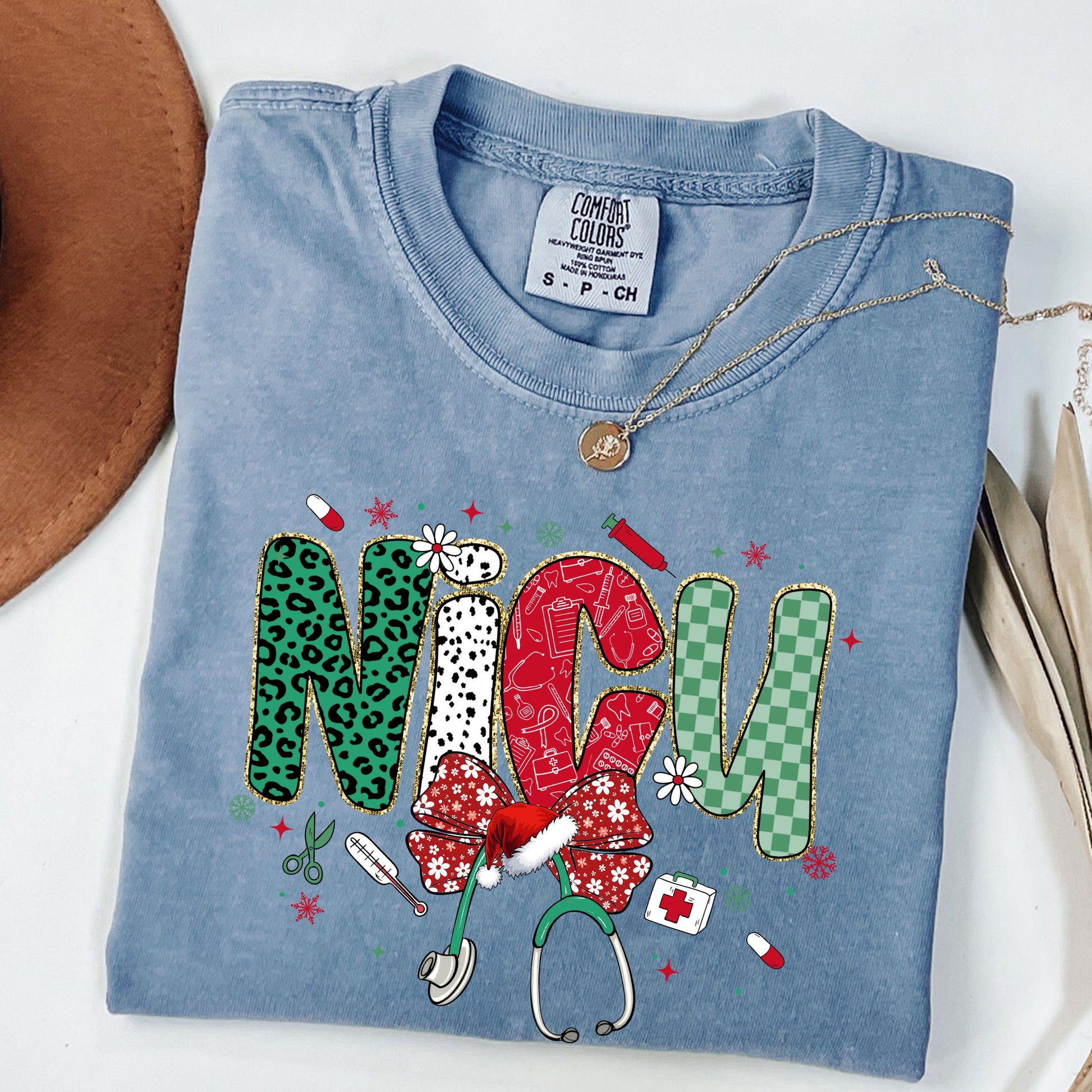 Comfort Colors® Nurse Christmas Shirt, Retro Checkered RN CNA NICU Tee, Cute Santa Hat Nursing Holiday Top, Gift for Nurse, Groovy Xmas