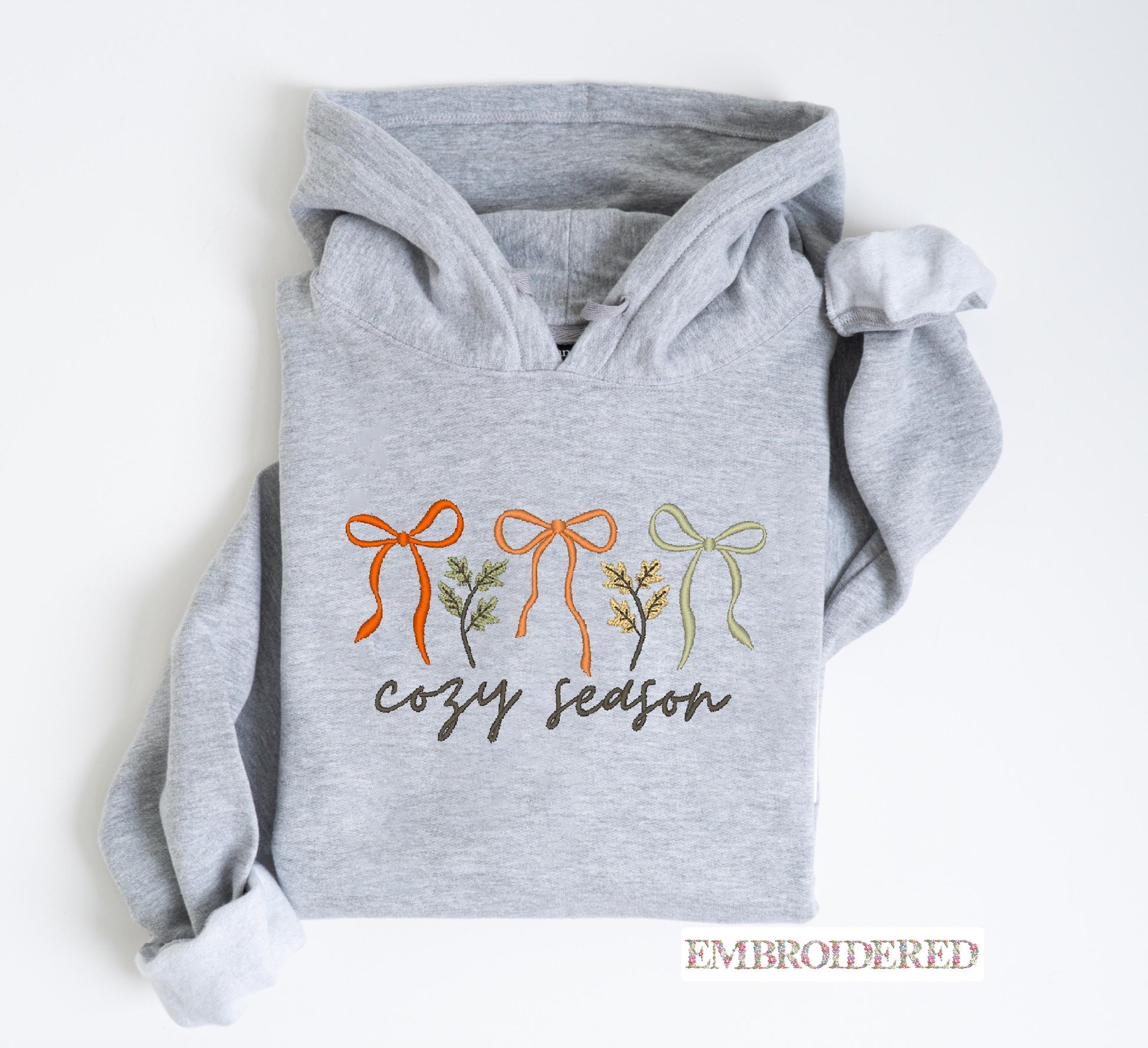 Get cozy in style with our embroidered “Cozy Season” design, available on Gildan 18000 crewneck sweatshirts and Gildan 18500 hoodies. Featuring three delicate bows with autumn foliage, this premium embroidered piece is ideal for chilly days, Thanksgiving gatherings, and cozy weekends.