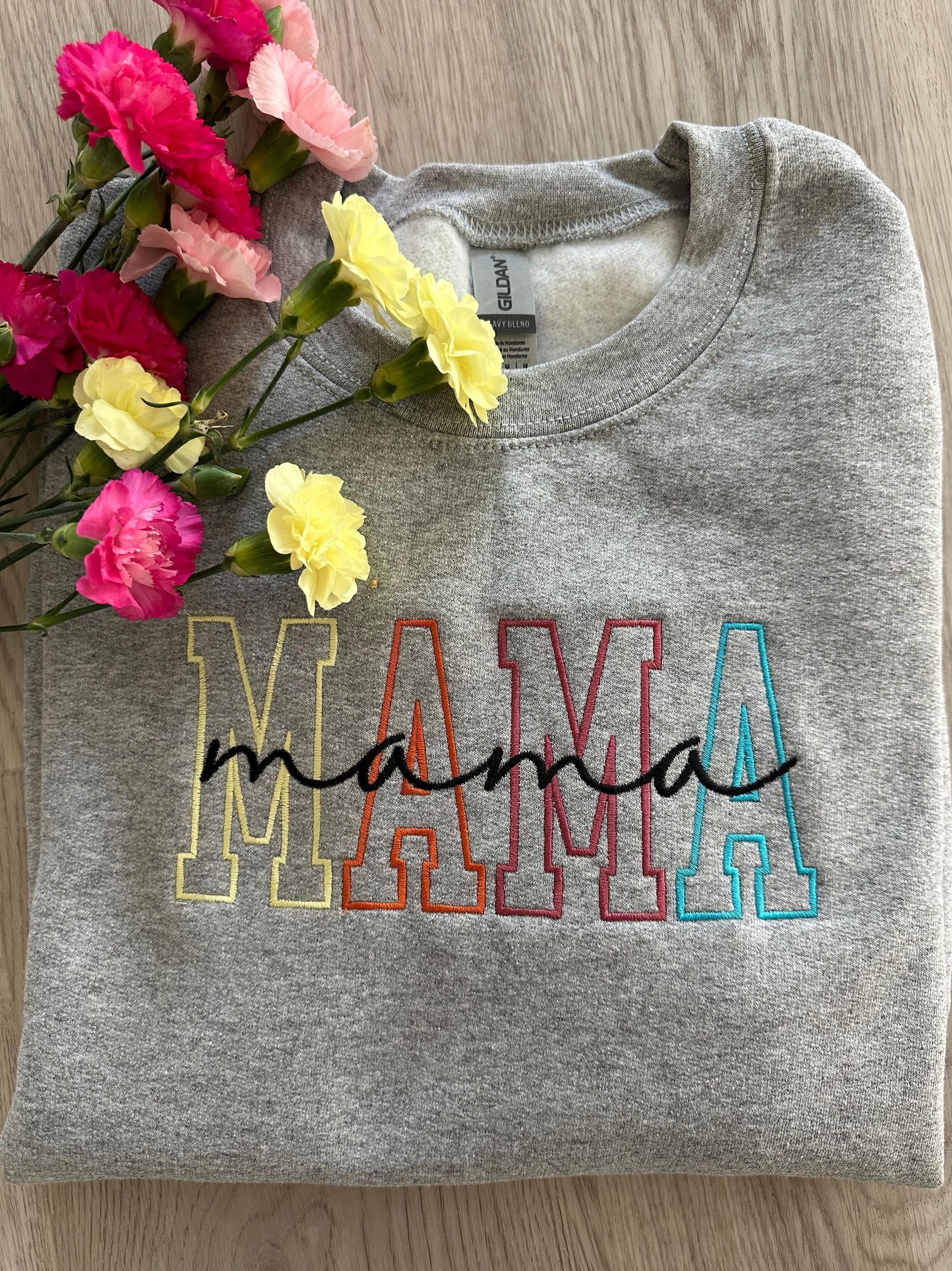 Celebrate motherhood in style with this Embroidered MAMA Sweatshirt! 🌸 Featuring a beautifully stitched colorful outline design, this cozy Gildan Heavy Blend crewneck is the perfect gift for moms. Whether you're looking for a Mother's Day gift, baby shower present, or a comfy everyday sweatshirt, this handmade piece is both stylish and meaningful.