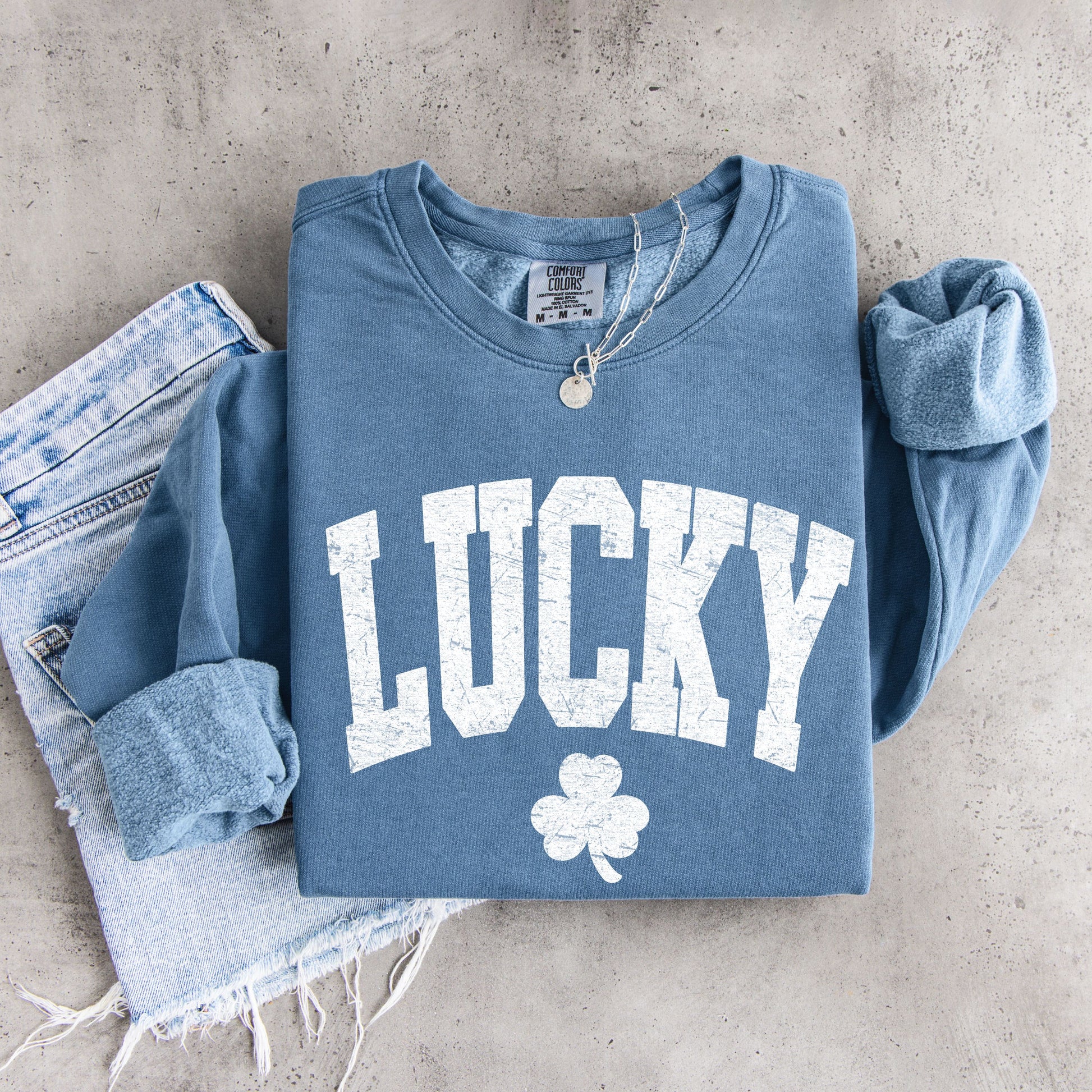 Our Lucky Shamrock Sweatshirt features a bold vintage-inspired “Lucky” arch design paired with a classic shamrock graphic.  This sweatshirt has that perfectly worn-in, relaxed look everyone loves.