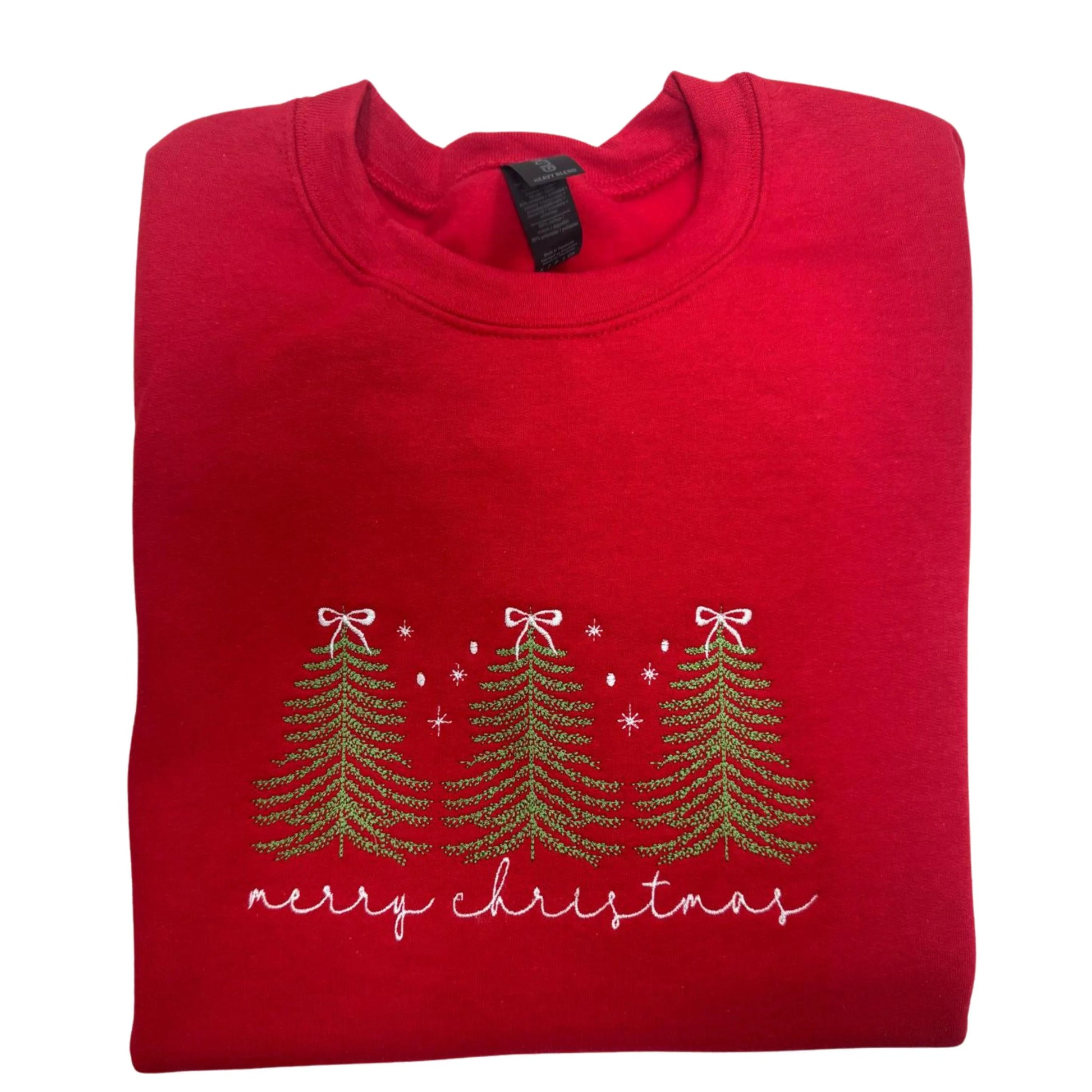This cozy and festive crewneck features a beautifully detailed embroidered design of three Christmas trees adorned with red bows, along with the timeless "merry christmas" script. It's the perfect blend of festive cheer and minimalist style.
