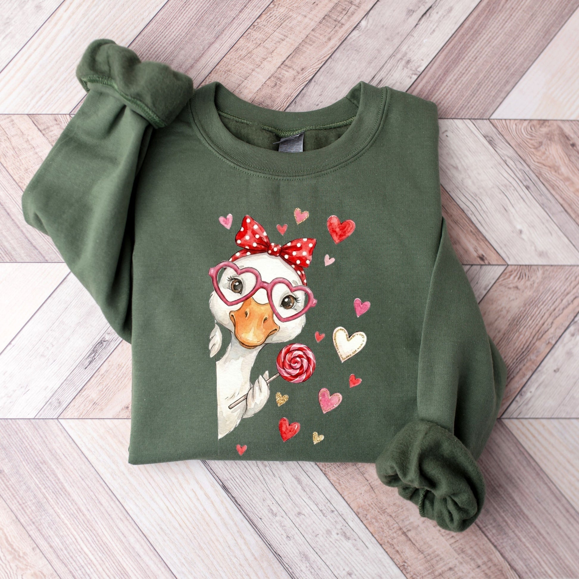 Spread the love this season with our adorable Sweet Goose collection! Featuring a charming watercolor-style goose wearing heart-shaped glasses and a polka-dot bow, this sweatshirt is the perfect blend of "cozy" and "cute."